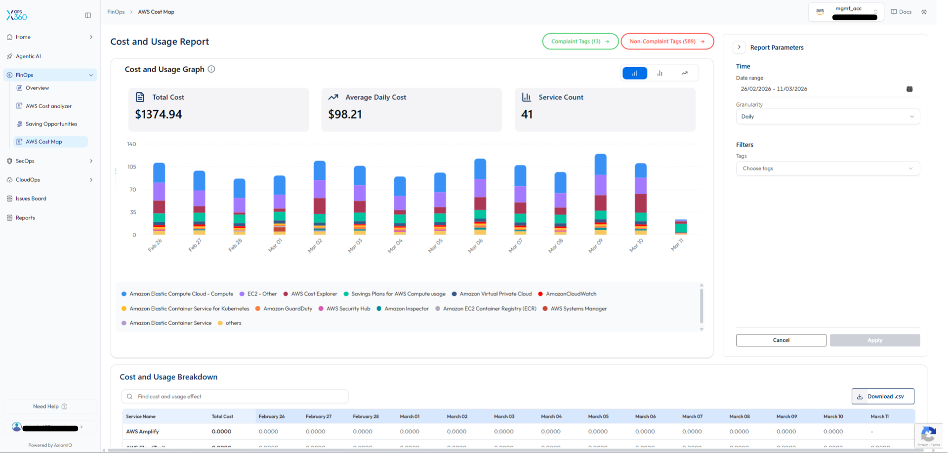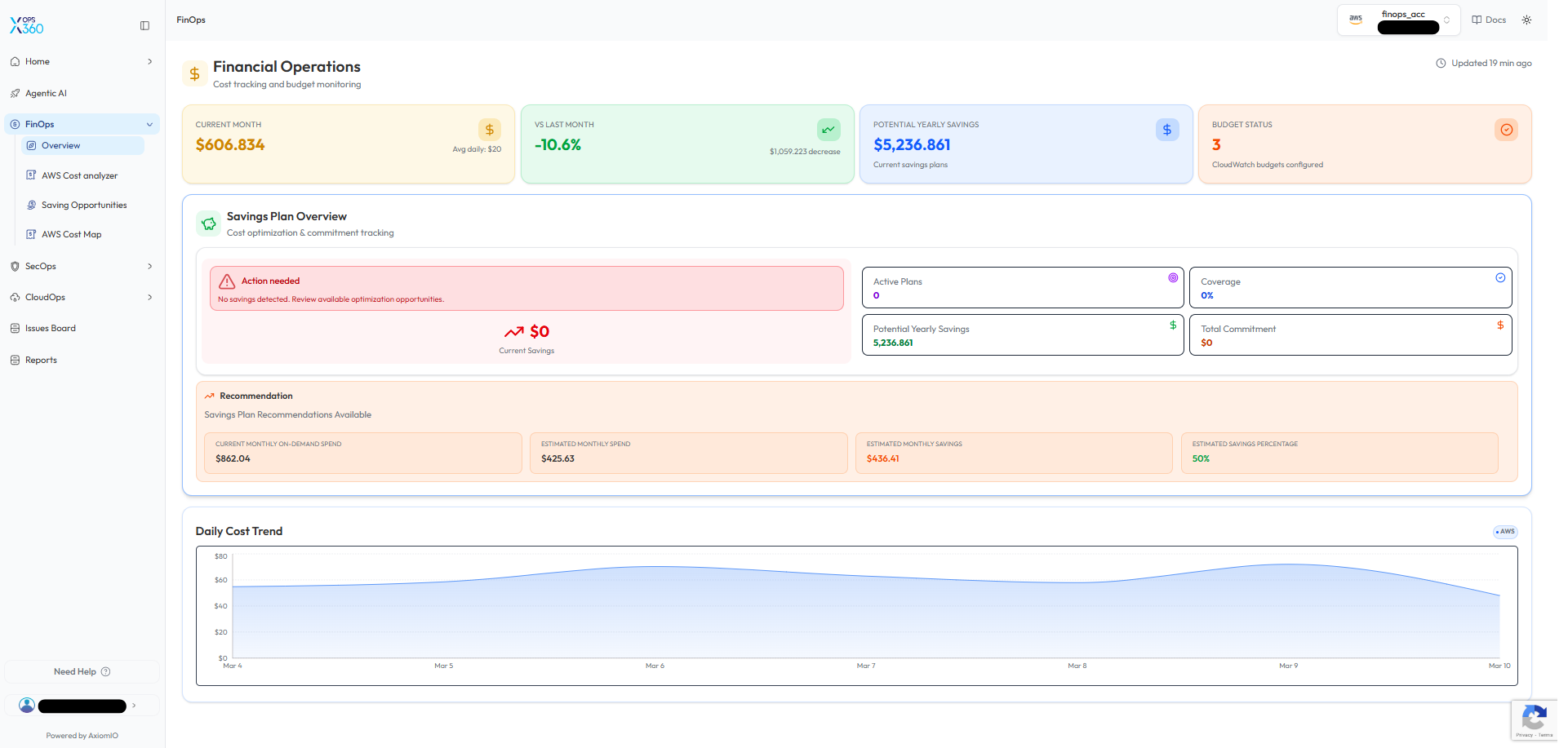 Cloud FinOps centralizes financial operations for cloud environments, enabling teams to monitor spending, analyze usage patterns, and optimize cloud costs efficiently. The platform provides unified visibility into AWS cloud spending, helping organizations track financial performance, detect anomalies, and identify potential cost-saving opportunities.