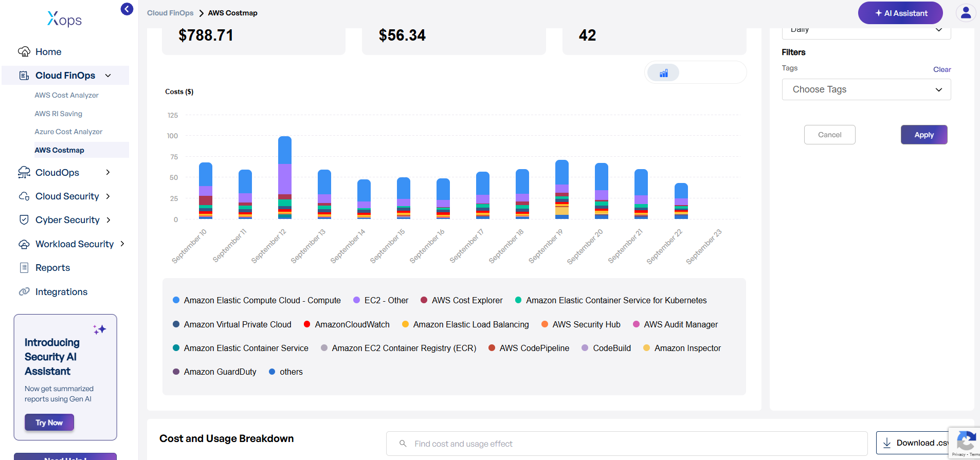 Tracks daily, monthly, and service-level spending trends to identify cost drivers.