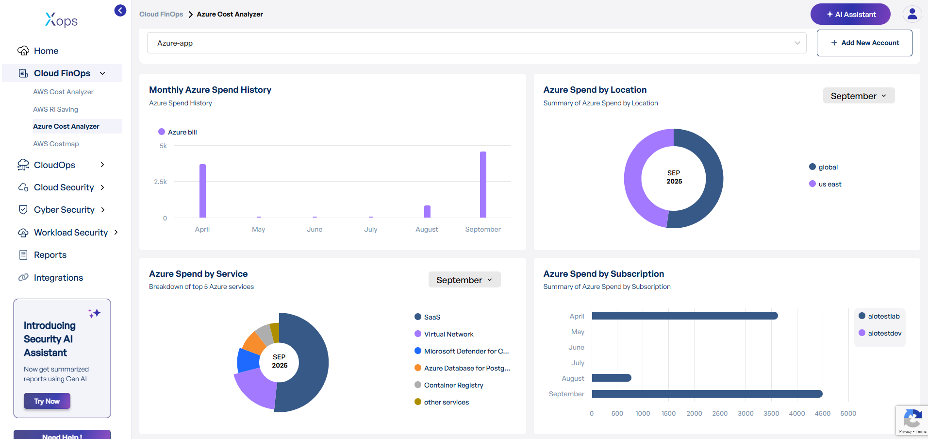 Spend by Service → highlights top cost drivers like Virtual Network, SaaS, Databases, and Security.