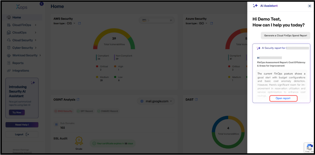 The AI Assistant will automatically begin generating the FinOps report for the management account integrated with the X-Ops application.