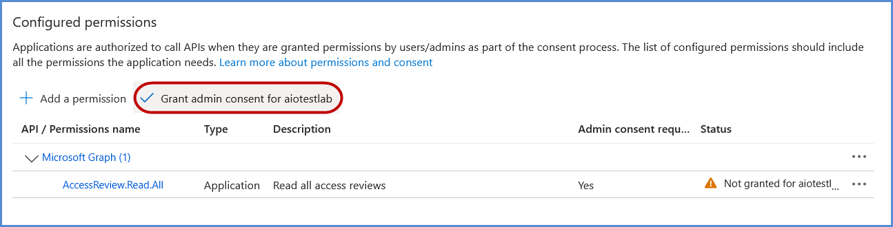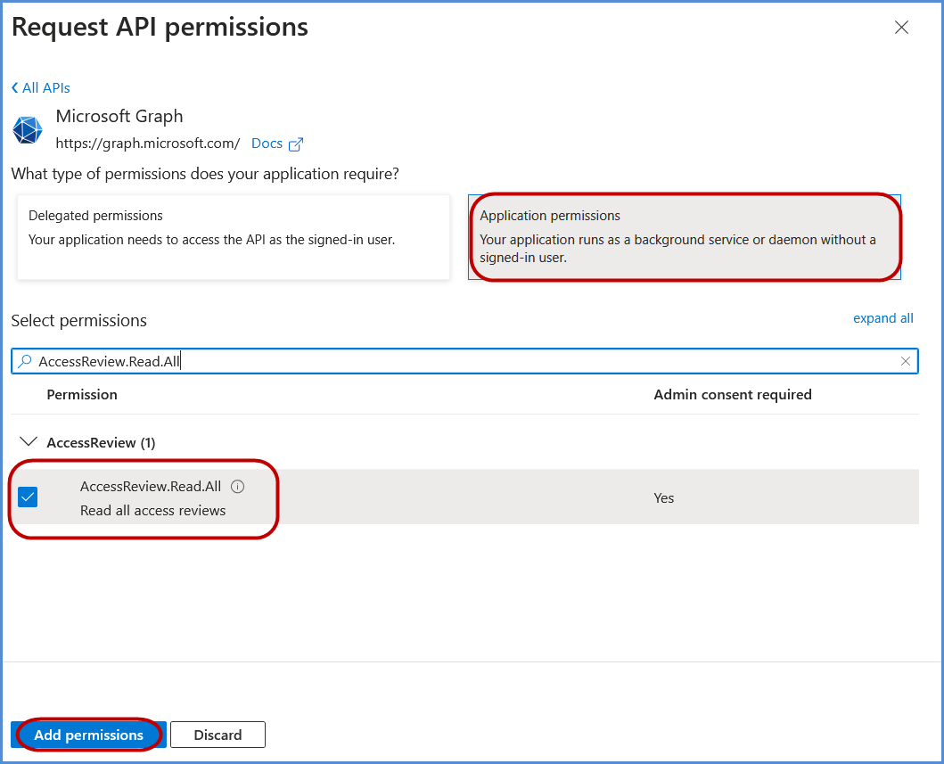 - Choose Application permissions, search for AccessReview.Read.All, select it, and click Add permissions.