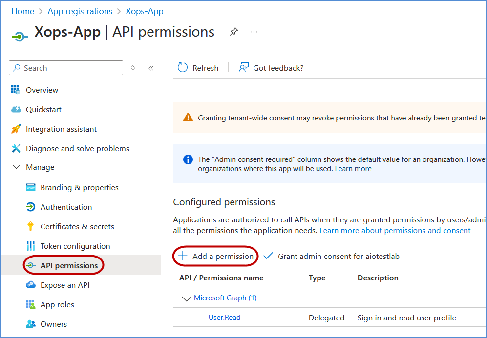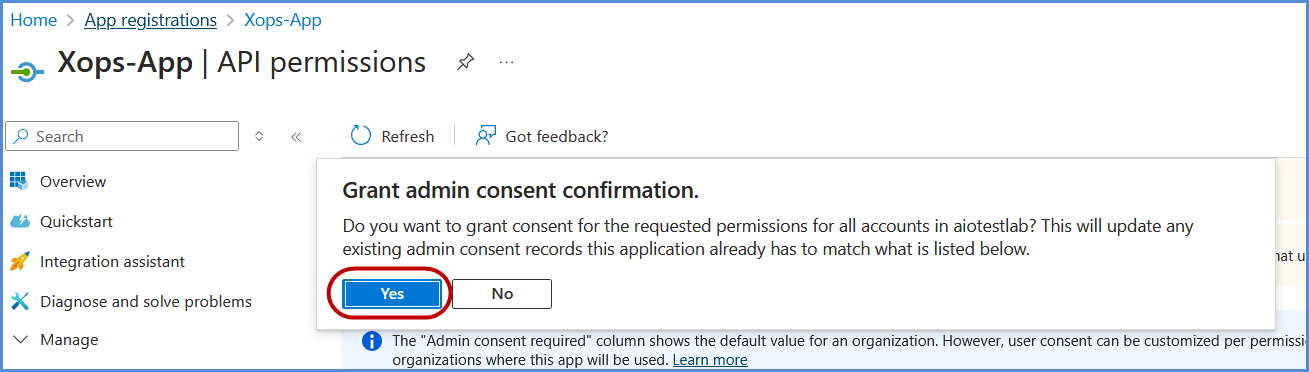 - Click on Grant admin consent and confirm by selecting Yes in the confirmation popup.