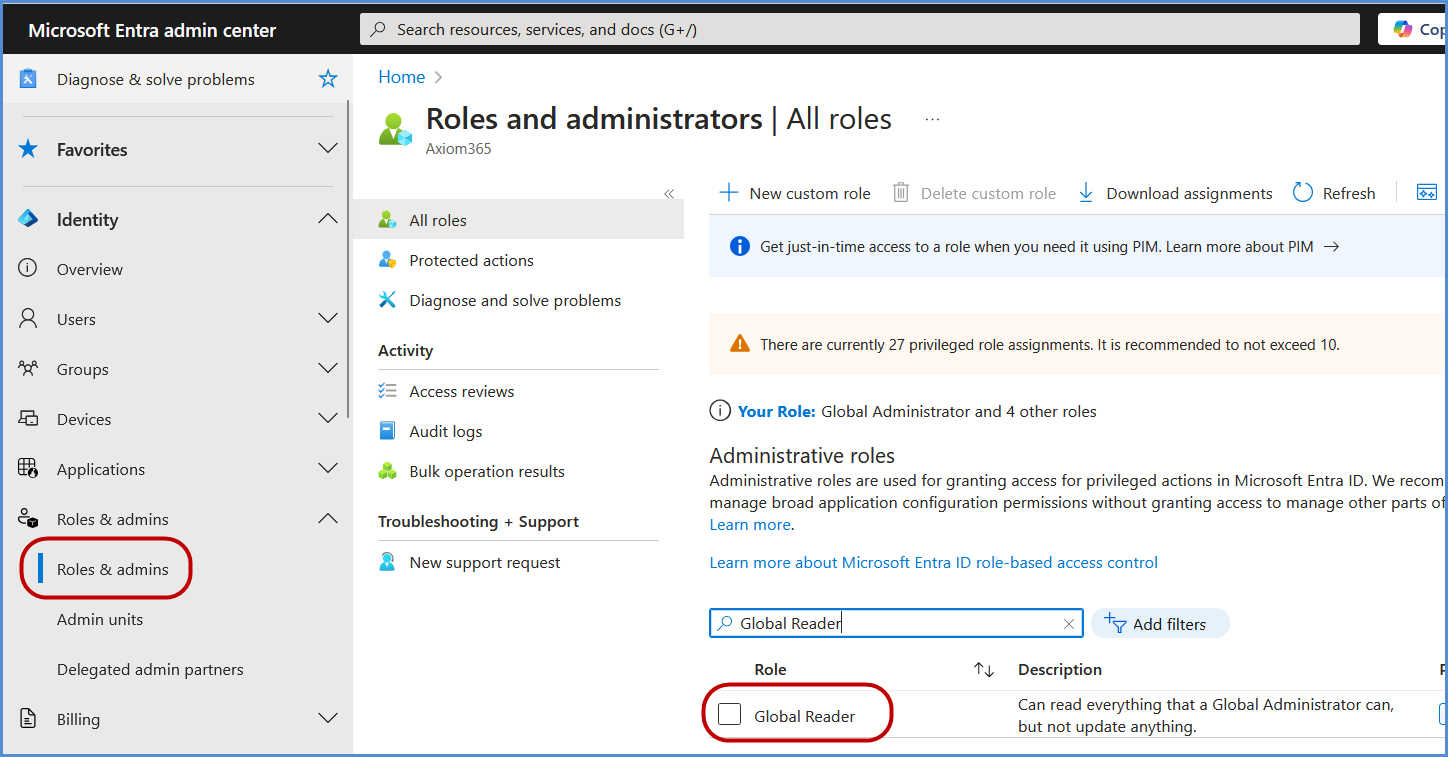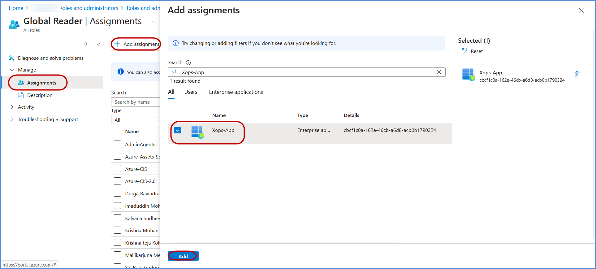 Under Assignments, search for the application registered in the previous step, select it, and click Add to grant the Global Reader role to the application.